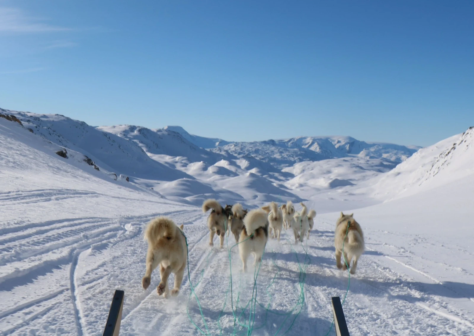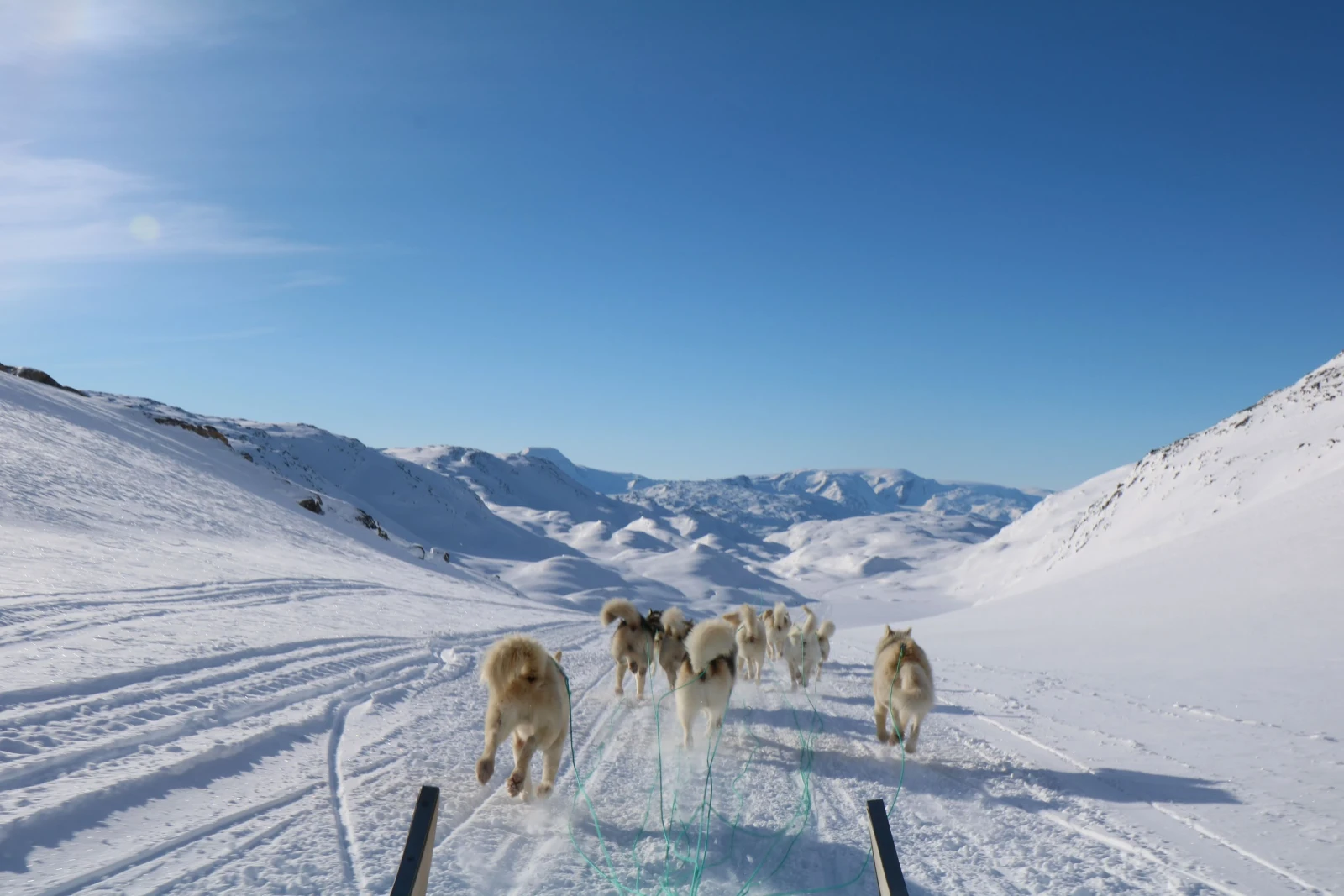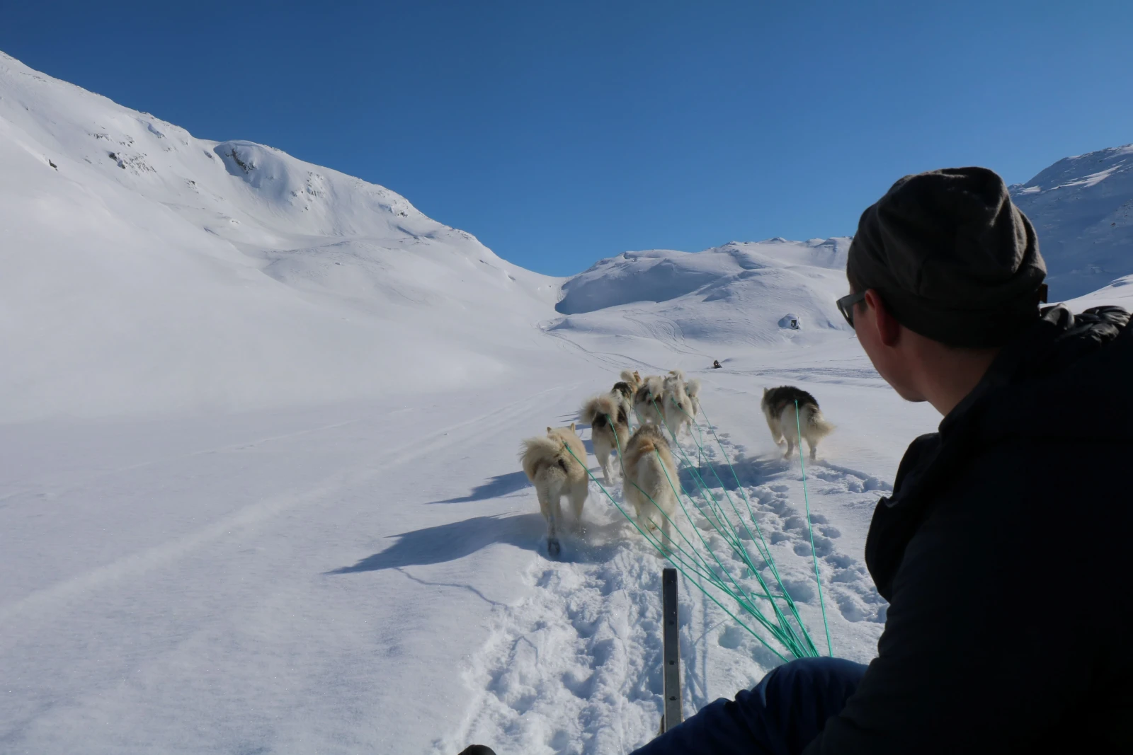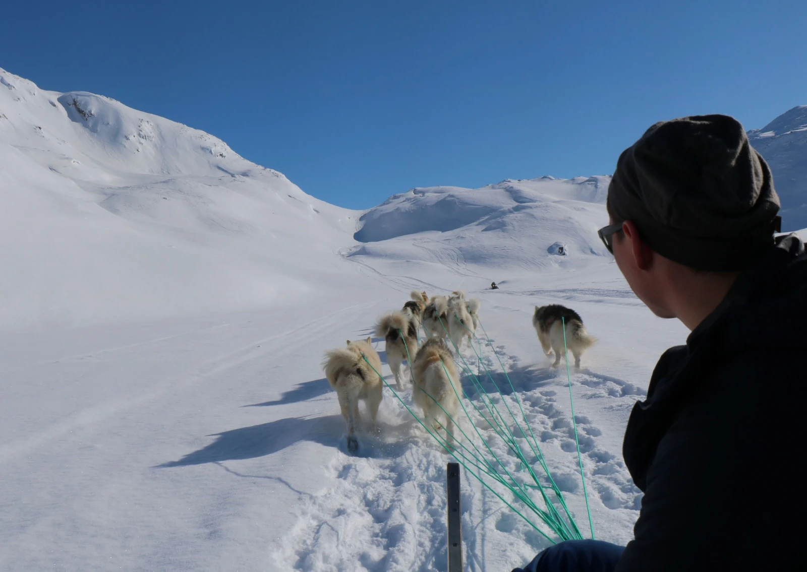 Al mattino, ci dirigiamo verso la valle di Kugarmit, lunga 10 chilometri. Oggi attraversiamo diversi grandi ghiacciai e laghi ghiacciati, fino al fiordo di Imaila. Proseguiamo quindi sul fiordo ghiacciato verso l'insediamento chiuso di Qernetivartivit, dove cerchiamo un buon posto per la pesca sul ghiaccio e tentiamo la fortuna catturando il merluzzo o l'halibut della Groenlandia. Pernottamento in rifugio