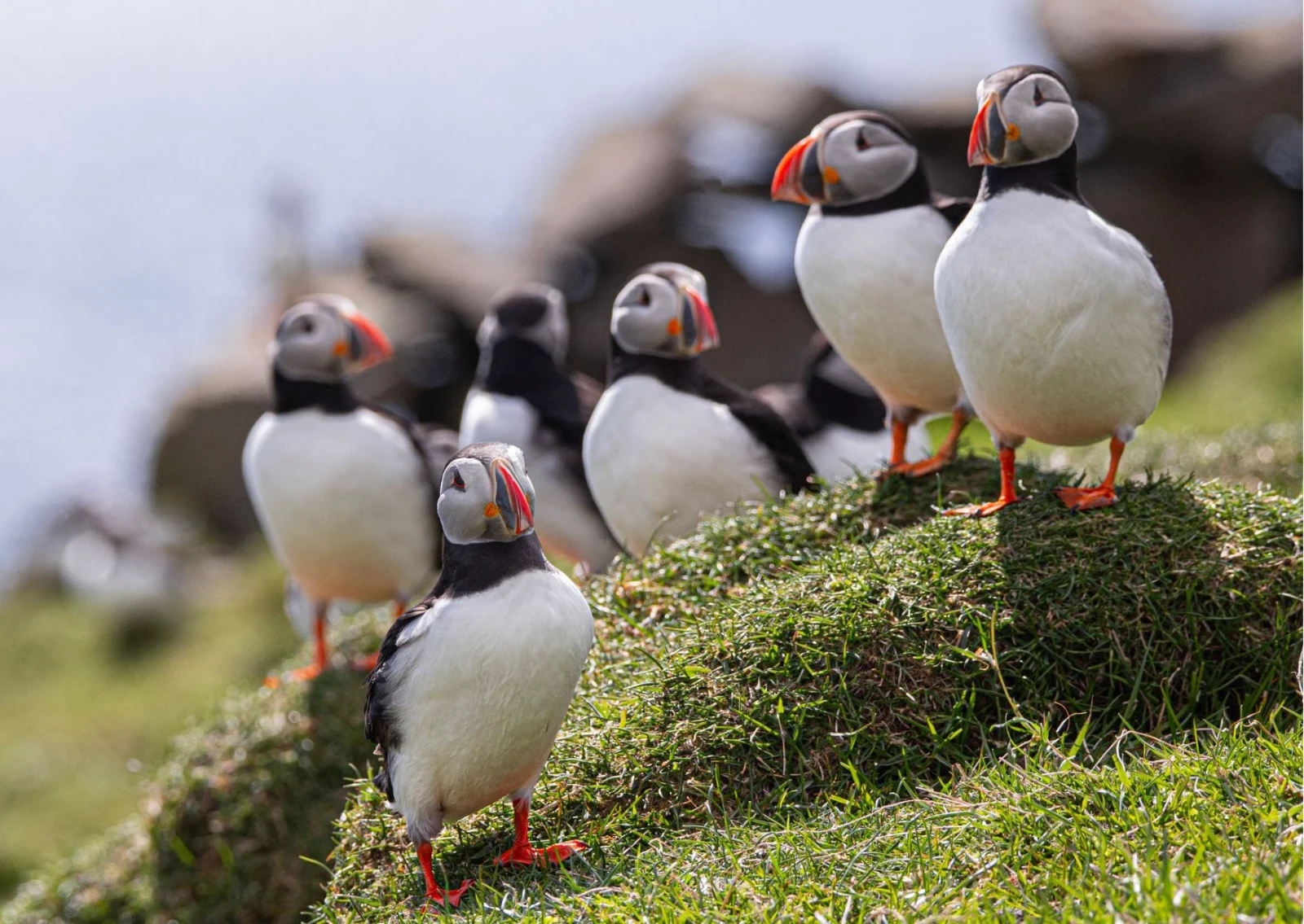 Di buon mattino, ci trasferiamo al molo di Sørvágur per prendere il battello con destinazione Mykines. Su questa isola, accompagnati da guida faunistica locale, camminiamo tra scogliere, insenature e bellissimi crinali erbosi sferzati dai venti atlantici. Questi paesaggi idilliaci sono i luoghi di nidificazione del pulcinella di mare, il celebre “puffin” uccello simbolo delle Isole Faroe. Camminando lungo i sentieri dell’isola nei mesi estivi, possiamo ammirare moltissimi esemplari intenti a pescare, oppure a rilassarsi e socializzare nei pressi delle loro tane